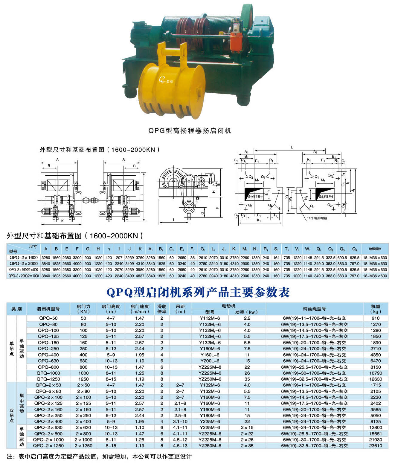 卷?yè)P(yáng)啟閉機(jī)有多種型號(hào):可以分為QPQ型普通卷?yè)P(yáng)啟閉機(jī)、QPK型快速卷?yè)P(yáng)啟閉機(jī)、QPG型高揚(yáng)程卷?yè)P(yáng)啟閉機(jī)、QPT型臺(tái)車(chē)式卷?yè)P(yáng)啟閉機(jī),QPM型門(mén)式卷?yè)P(yáng)啟閉機(jī),QH型弧門(mén)卷?yè)P(yáng)啟閉機(jī)。卷?yè)P(yáng)啟閉機(jī)又分為:平門(mén)卷?yè)P(yáng)式啟閉機(jī);弧形門(mén)卷?yè)P(yáng)式啟閉機(jī);雙吊點(diǎn)卷?yè)P(yáng)式啟閉機(jī);快速卷?yè)P(yáng)式啟閉機(jī);移動(dòng)式臺(tái)車(chē)啟閉機(jī);雙吊點(diǎn)卷?yè)P(yáng)式啟閉機(jī)分為:集中驅(qū)動(dòng)和單獨(dú)驅(qū)動(dòng)兩種;卷?yè)P(yáng)式啟閉機(jī)手搖、電動(dòng)兩用式規(guī)格分為:5噸、8噸、12噸、16噸、25噸;電動(dòng)式規(guī)格分為:40噸、63噸、80噸、100噸、125噸、160噸、200噸,可以根據(jù)用戶(hù)要求設(shè)計(jì),并能生產(chǎn)雙吊點(diǎn)卷?yè)P(yáng)式啟閉機(jī),該機(jī)是一種水利工程專(zhuān)用機(jī)械,廣泛用于水利工程閘門(mén)的啟閉,是農(nóng)田灌溉、水產(chǎn)養(yǎng)殖、農(nóng)業(yè)經(jīng)濟(jì)開(kāi)發(fā)區(qū)、污水處理廠(chǎng)、水利發(fā)電站、水庫(kù)(水閘、堤壩、隧道、管 道)等進(jìn)水、退水閘的配套機(jī)械,山區(qū)、平原有、無(wú)電地區(qū)均可使用。