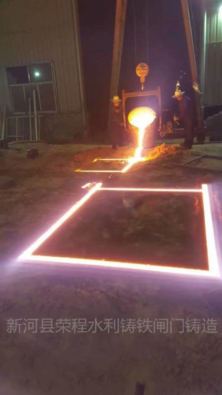 鑄鐵閘門澆注鑄造中,工作人員在認真工作。鑄鐵閘門是一種小型平板閘門,廣泛使用于取水輸水、市政建設,給水排水、農田灌溉等工程中,通常設置在渠道、涵管的進水口,用作工作閘門調節流量、控制水位,或用作檢修閘門關閉孔口擋水。鑄鐵閘門有方形、圓形兩種。鑄鐵閘門一般由門葉和門框兩部分組成,門體和門框的材料為鑄鐵,一般整體鑄造、整體加工。門體一般采用面板與加強肋的結構,面板可做平面或拱形。門體一般整體鑄造和機加工,但尺寸較大的可采用分塊組成式。門體上一般采用整體式金屬止水,兼作支承滑塊,金屬止水用同材料制作的沉頭螺釘緊固在門體上,螺釘頭部與止水工作面一起精加工,一些尺寸較大的也可"P"形橡皮止水。